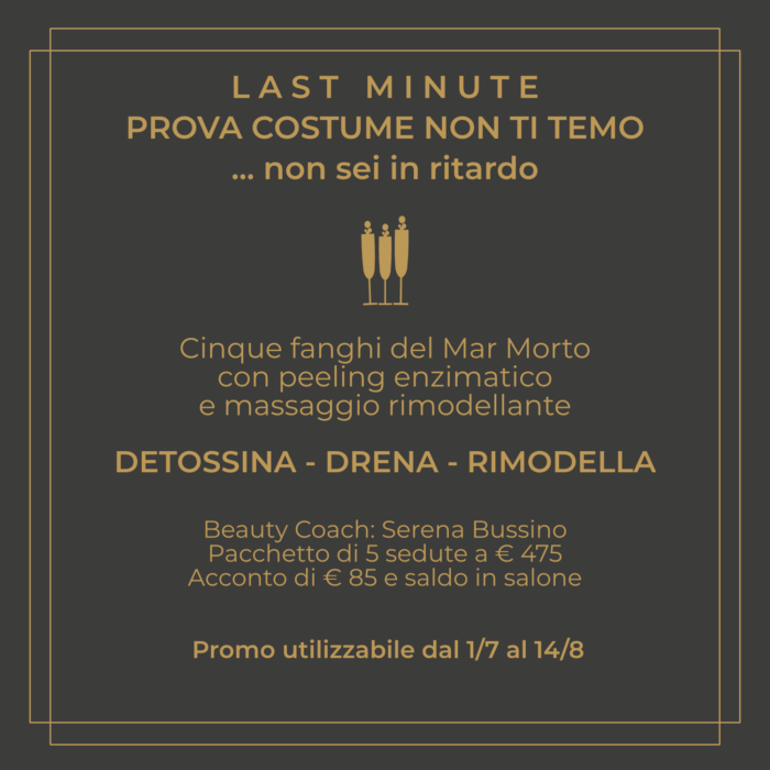 Cinque sedute in cui, dopo una ricca preparazione che prevede l’alternare del peeling enzimatico e del siero riattivante a base di cristalli marini e olii essenziali, il prezioso dono del Mar Morto, il suo fango, viene lasciato in posa in avvolgimento per poi essere massaggiato con sapienti manovre drenanti e rimodellanti.